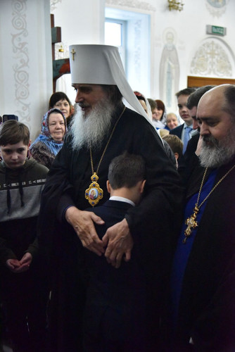 Ученики гимназии тепло приветствовали митрополита, встречая его хлебом и солью, а также исполняя песнопение «многая и благая лета».