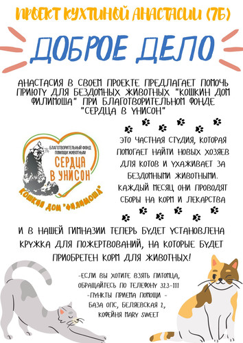 В первую неделю Великого поста ученики нашей гимназии подготавливали проекты добрых дел, которые мы могли бы осуществить всей нашей гимназической семьей. И ученическим советом были выбраны три проекта, с которыми вы можете ознакомиться ниже, а также вы можете посодействовать и принять участие во славу Божию!