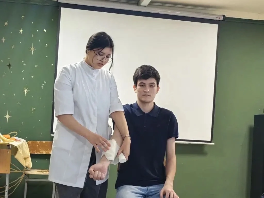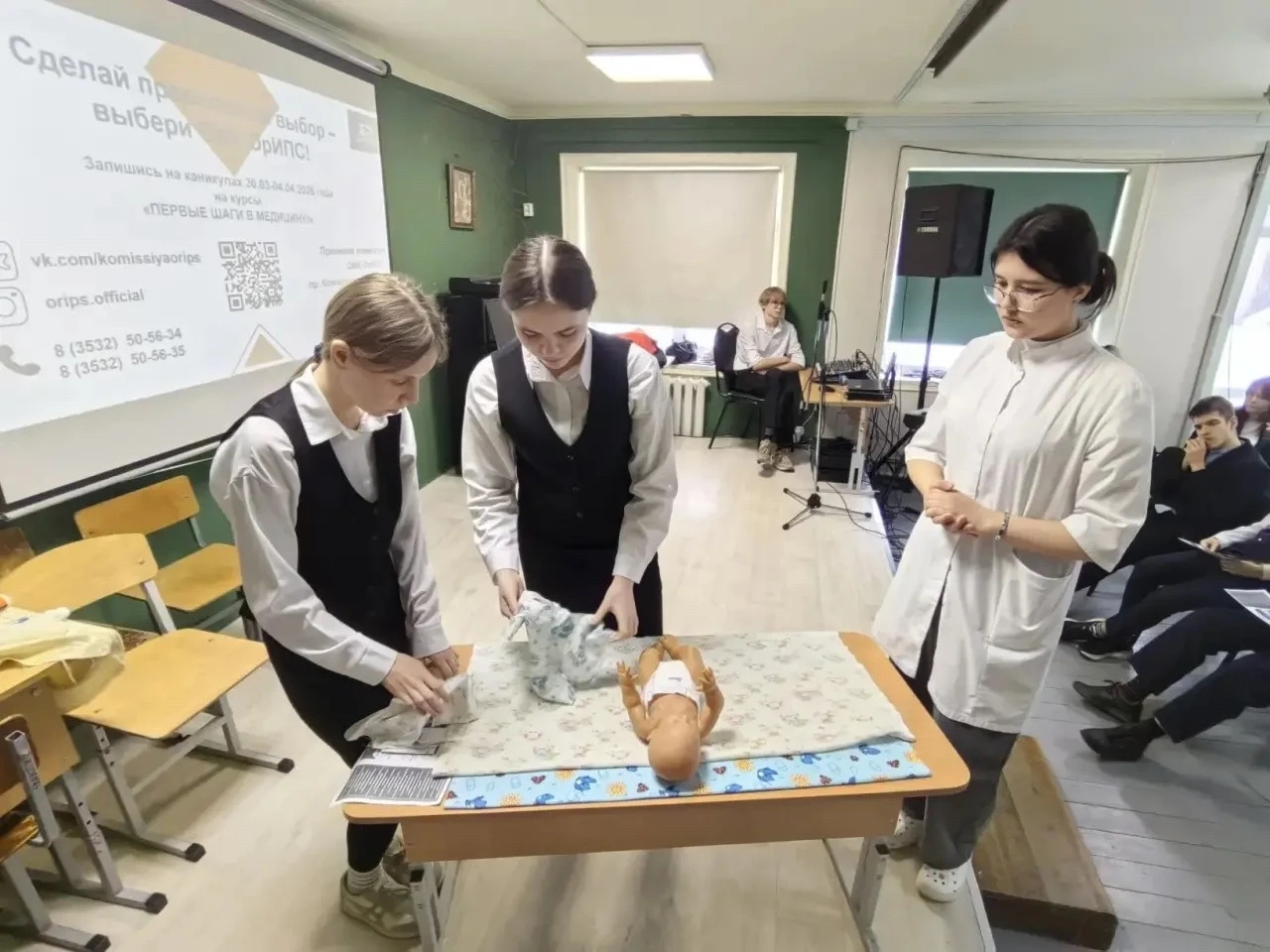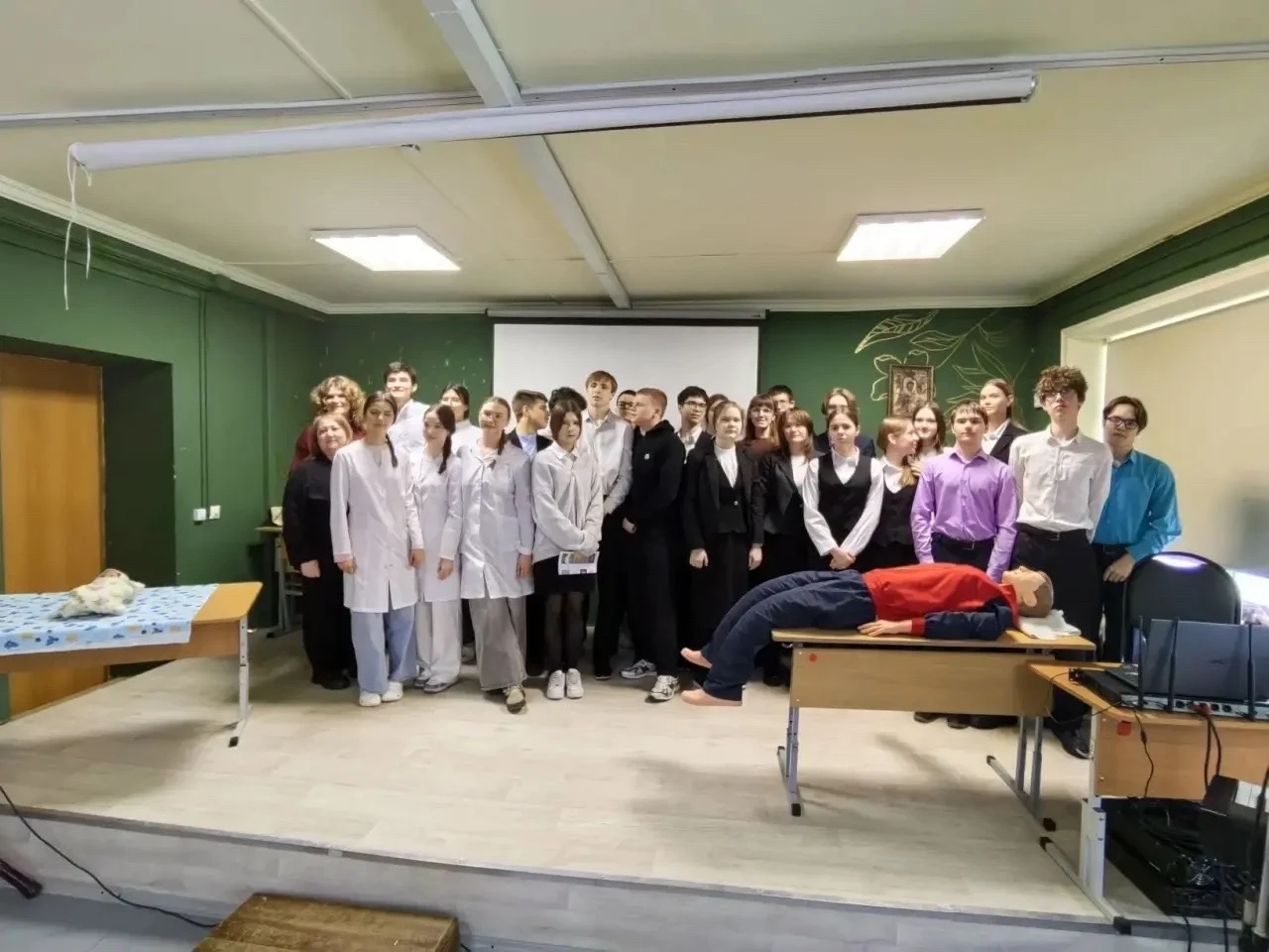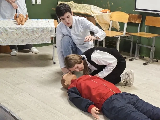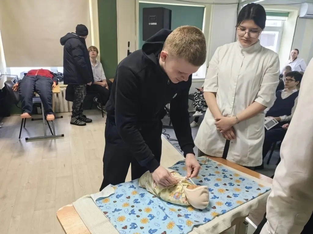 Студенты вместе с преподавателями провели для старшеклассников мастер-класс по оказанию первой неотложной медицинской помощи. Ознакомили с алгоритмом проведения сердечно-лёгочной реанимации, оказания первой помощи при кровотечениях, показали как правильно пеленать грудничка. После чего гимназисты на практике смогли отработать новые знания.