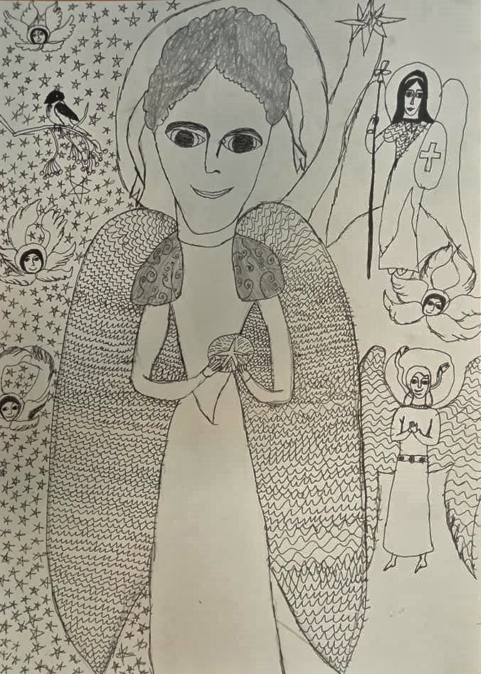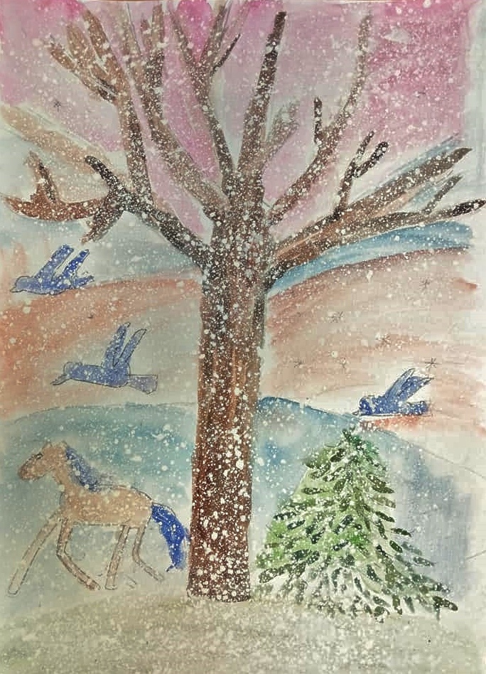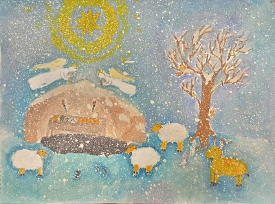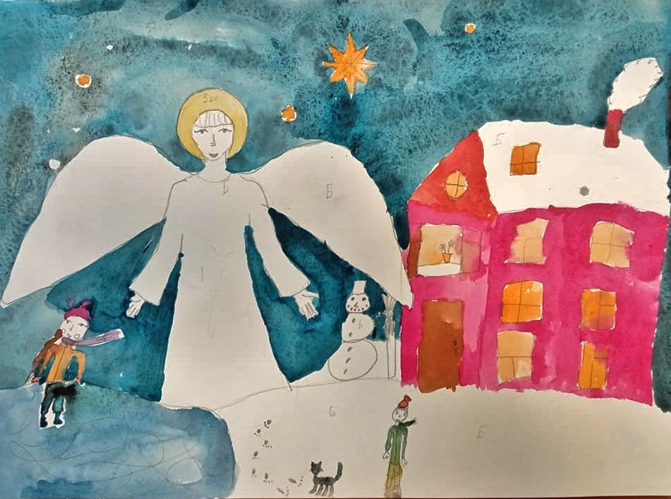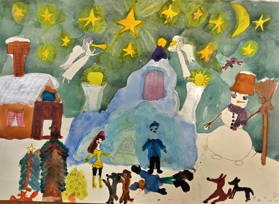 Ангелов ребята любят изображать, они почти в каждом рисунке – вестники Рождества Христова. То невидимые, парят над детьми в небесах, то вылепленными из снега фигурами украшают пространство, и напоминают об особом статусе зимы: время рождения Спасителя, посмотрите, как удивительно нежно и тепло окружают звери и ангелы Младенца Христа на рисунке Таисии Пыльневой. Таисия увидела сцену рождества в зимнем пейзаже, лишенном людей, только звери и огромная звезда, пульсирующая в небесах. И снег. Ребятам очень понравился прием набрызгивания краски на бумагу, белые капли создают иллюзию снежных хлопьев, смягчают колорит работы, объединяя краски в гармонию туманной дымки. Оля Федотова, Настя Ломакина, Таня Илигенова, Демакина Саша и Купреянова Вероника воспользовались этим приемом для создания зимнего настроения в своих композициях.