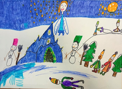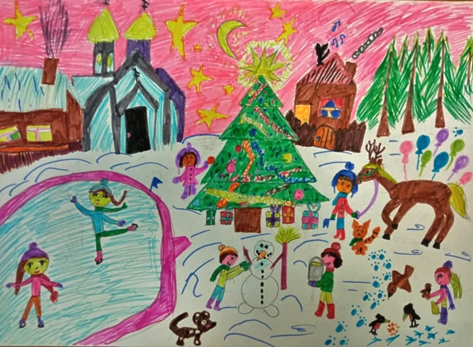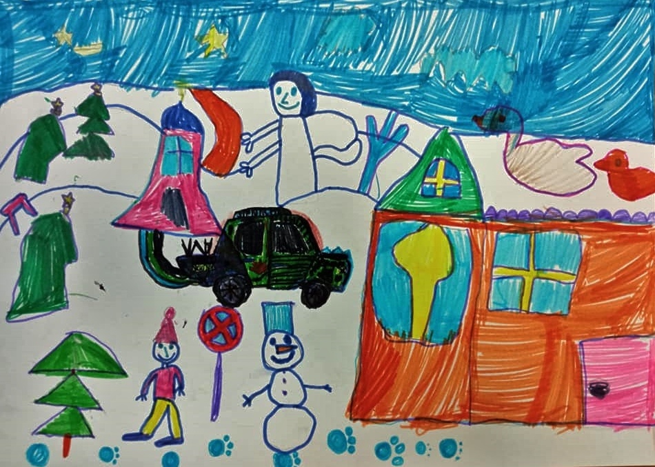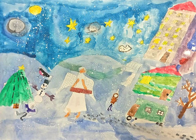 Линии и пятна, проведенные фломастерами, получаются яркими и выразительными. Колосова Аня создает обобщающий образ зимних забав, используя фломастеры в работе. До самого вечера в её композиции дети катаются на коньках, лепят снеговиков рядом с храмом. Михайлов Иван изобразил ледяную крепость, поставил двух снеговиков сторожами, а сам «купается» в снегу. Арсений Перов ни в одном рисунке не обходится без изображения машин и дорожных знаков, вот и в Рождественскую ночь возле храма стоит автомобиль, готовый после вечерней службы отвезти домой прихожан. А рядом – ангел-хранитель, простирающий руки над машиной и дорогой.