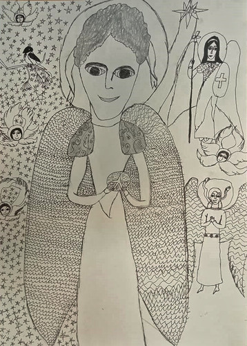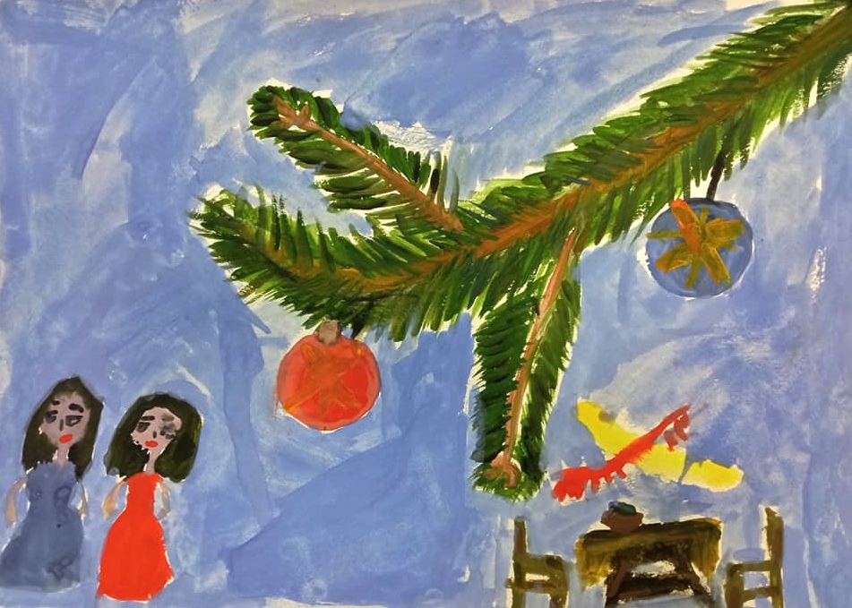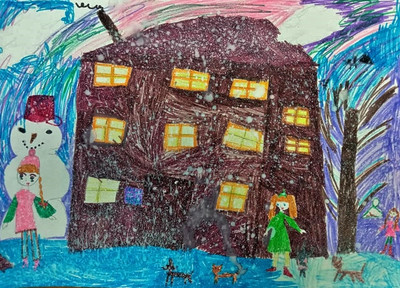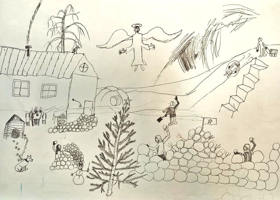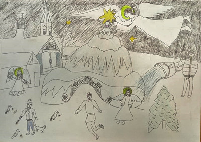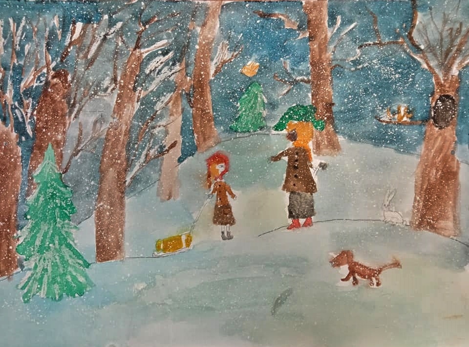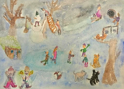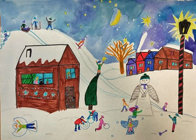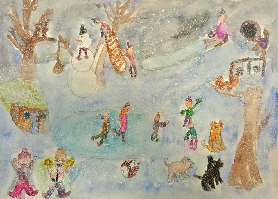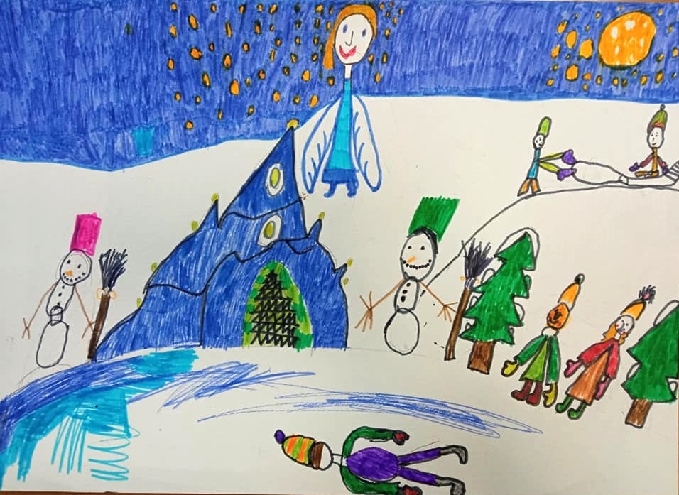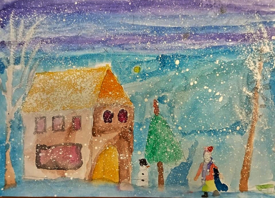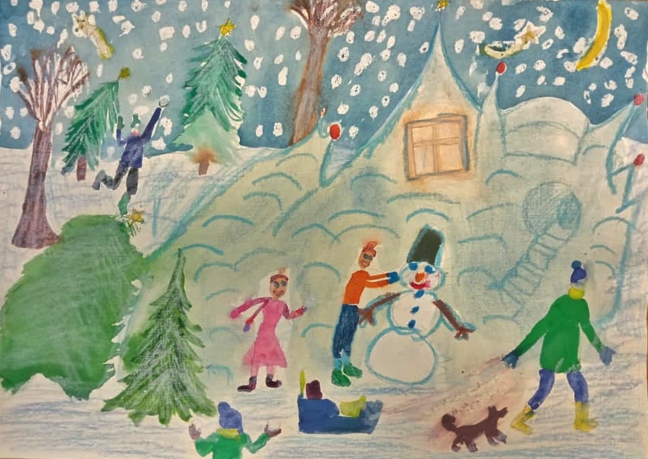 Мария Петаева, Егор Рудаков и Ярослава Холостова создали прекрасные графические композиции. Простой карандаш – самый верный и первый помощник художника. Как внимателен в своем рисунке Егор – всё подметил – и сложенная из накатанных снежных комов крепость, и будка из досок – пристанище собаки на цепи, и горка со ступеньками, вырубленными в снегу, ёлка, после праздника выдворенная на улицу и продолжающая радовать детей, весело перекидывающихся снежками. У Марии Петаевой причудливый снежный или ледяной дворец, похожий на огромный торт и ангел, зажигающий звезды в небе. А Ярослава Холостова создает ангелочка с пуховыми крылышками, как будто связанными на спицах, словно оренбургский пуховый платок… Надеемся, что вам понравятся наши рисунки.