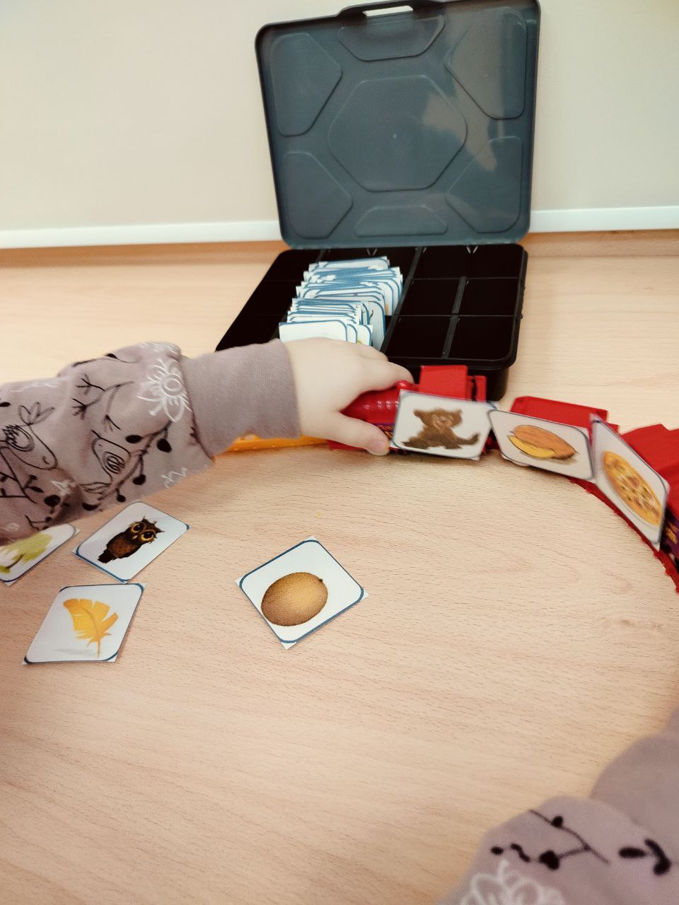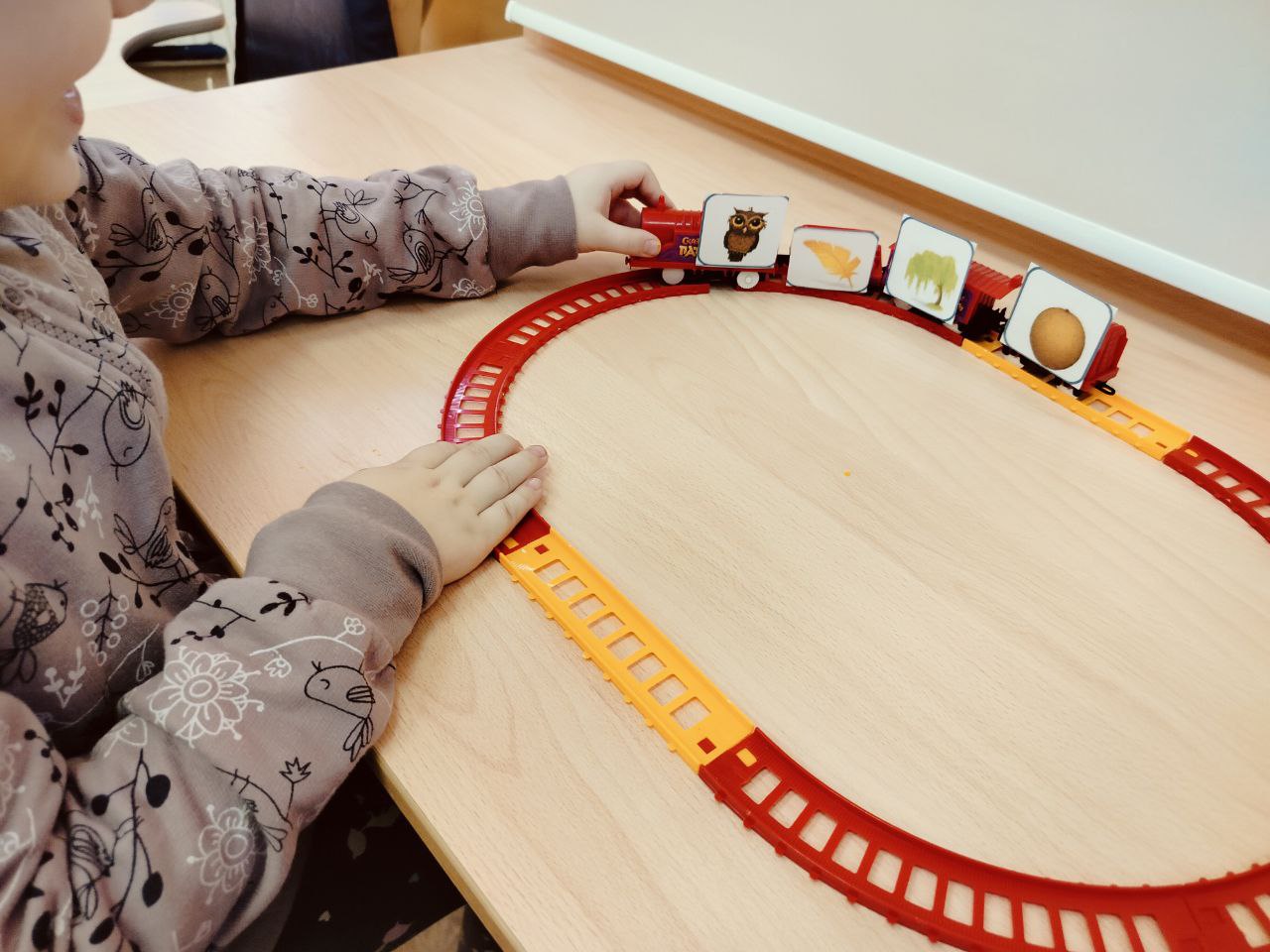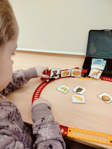 Например, «Паровозик из Ромашково». В случае с ребенком, которому необходимо формирование экспрессивной речи, у паровозика были пассажиры или грузы, в названии которых были слова первой слоговой структуры и высокочастотные. На простой паровоз из магазина игрушек были наклеены самоклеящиеся липучки, были распечатаны картинки с изображением объектов первой, второй и третьей слоговой структуры, подходящего размера, заламинированы, закруглены углы для безопасности ребенка. В процессе игры, на начальном этапе, ребенок мог сам менять пассажиров и/или груз, а логопед называла изображенное на каждой карточке. На следующем этапе игры логопед просила «посадить» в вагон определенного пассажира и, в зависимости от успешности выполнения ее просьбы, становилось понятно какие слова ребенок уже знает и имеет в пассивном словарном запасе.