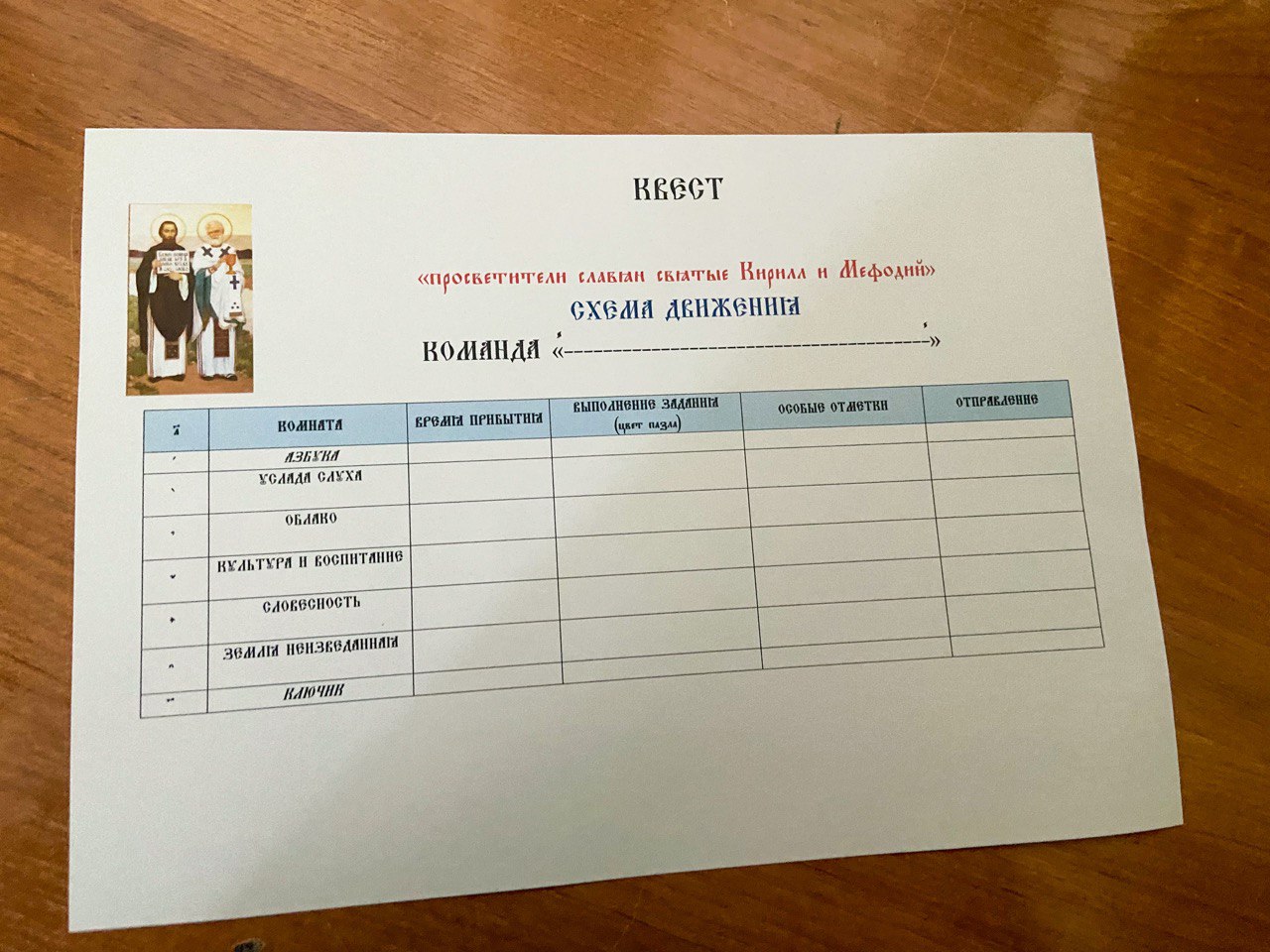 На каждом из этапов команды выполняли различные задания, а за каждый правильный ответ они получали часть фразы-подсказку. Далее участники квеста прибыли на последнюю станцию «Ключик», здесь они сопоставили полученные подсказки, и многие смогли составить фразу « Въ нача́лѣ бѣ́ Сло́во, и Сло́во бѣ́ къ Бо́гу, и Бо́гъ бѣ́ Сло́во». Это были первые слова, написанные Кириллом и Мефодием на славянском языке.