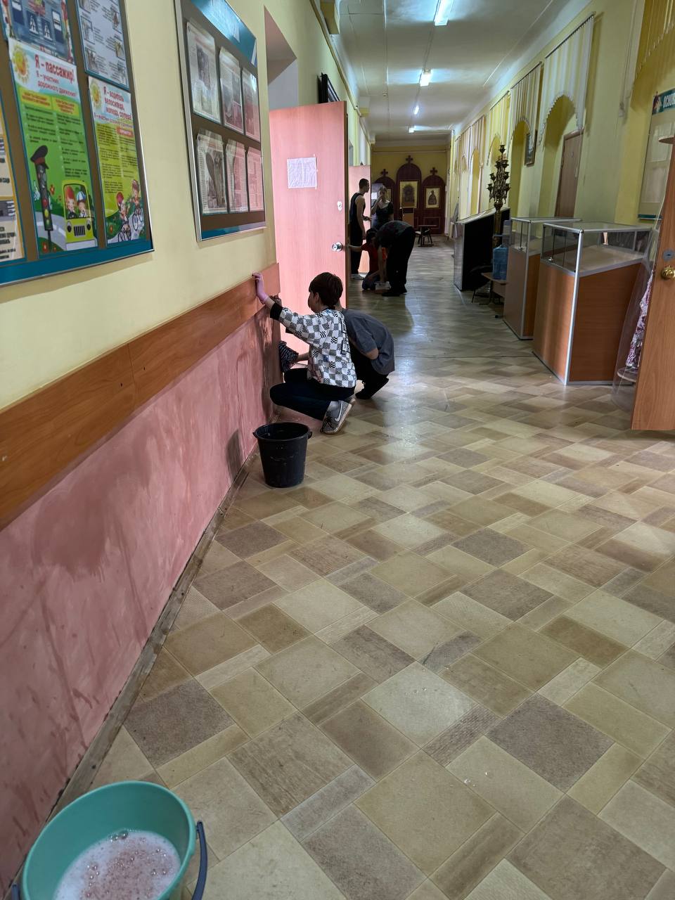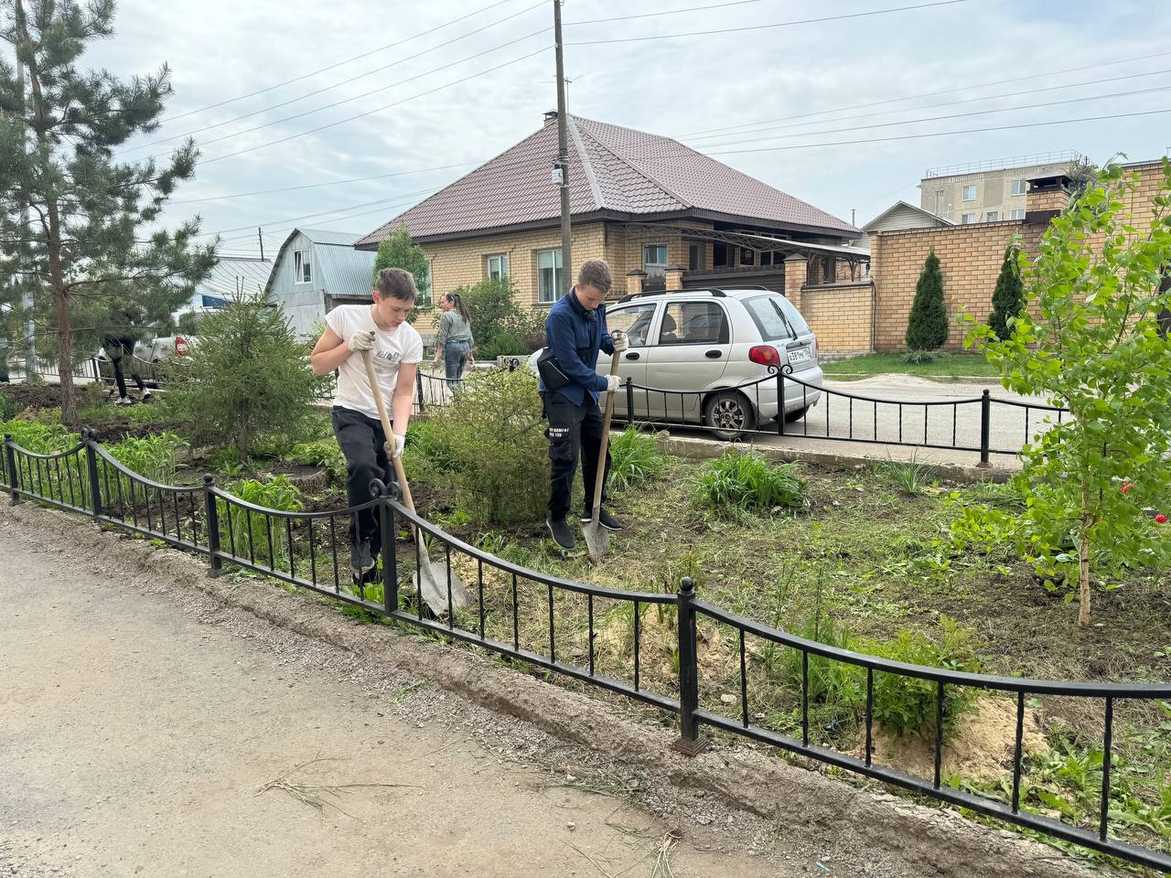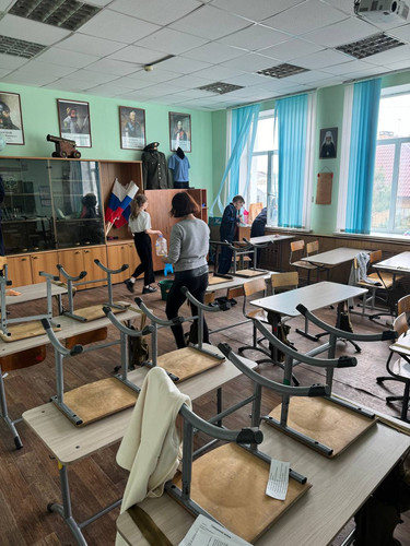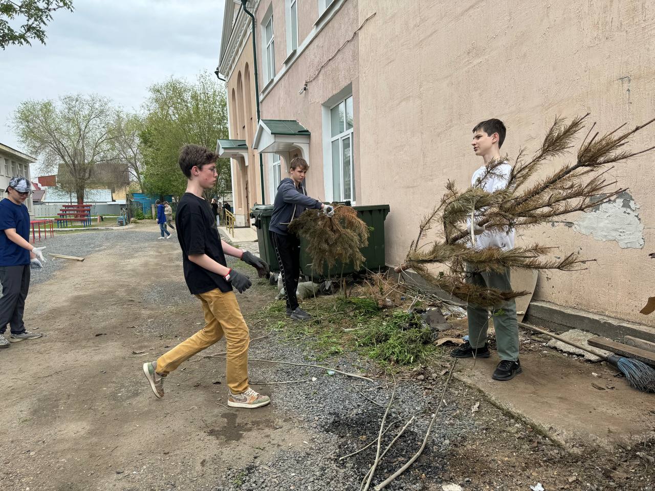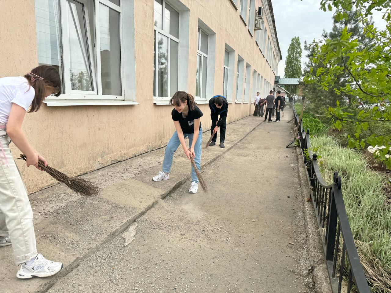 Часть людей убиралась внутри корпусов, другие вышли на улицу, чтобы привести в порядок территорию школы. Ученики собрали мусор, подмели дорожки и убрали старые листья.