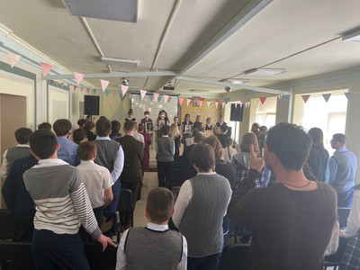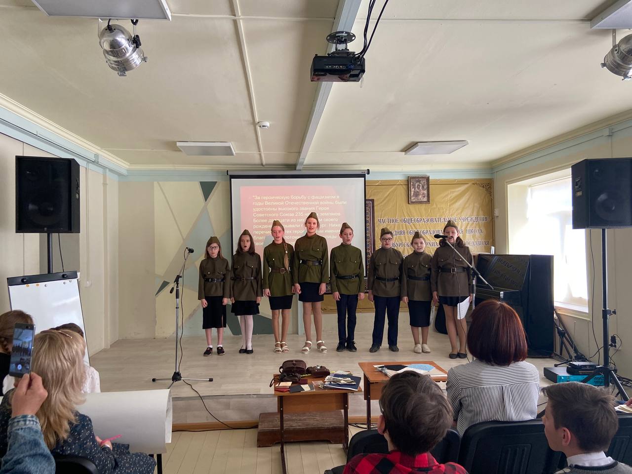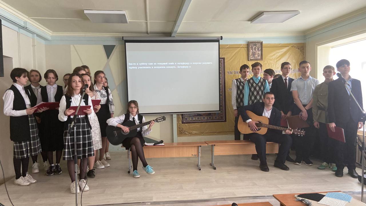 Средняя и страшная школа готовили проекты посвященные памяти Великой Отечественной Войны. Гимназисты говорили не только об исторических событиях, но и о том, что поддерживало наш народ в самые тяжелые времена: об изобразительном искусстве, о песнях, о кино, о церкви. 10 класс подготовил проект на тему «Союзники СССР в годы ВОВ» и торжественно завершил творческий экзамен исполнив песню День Победы на разных языках.
