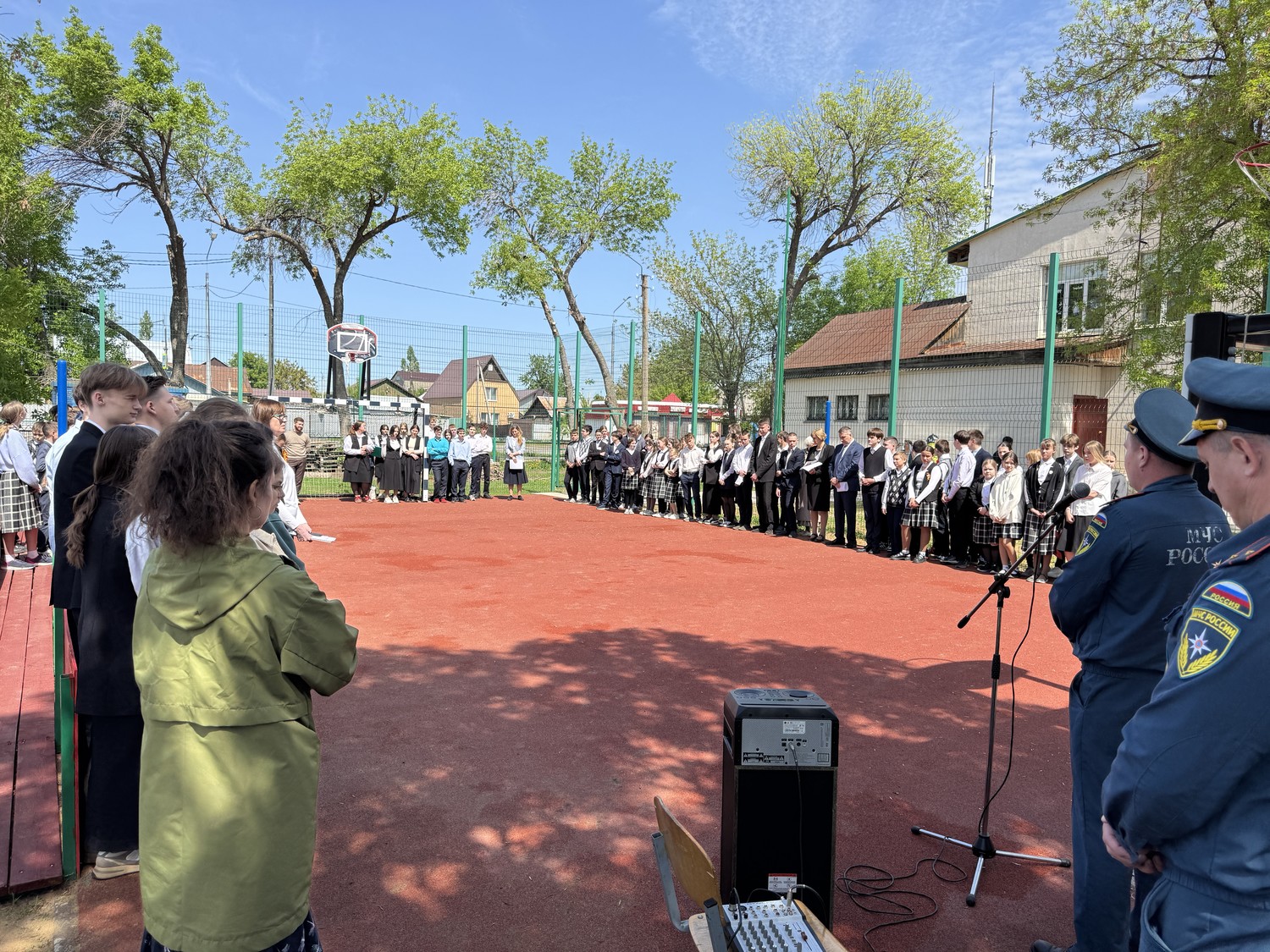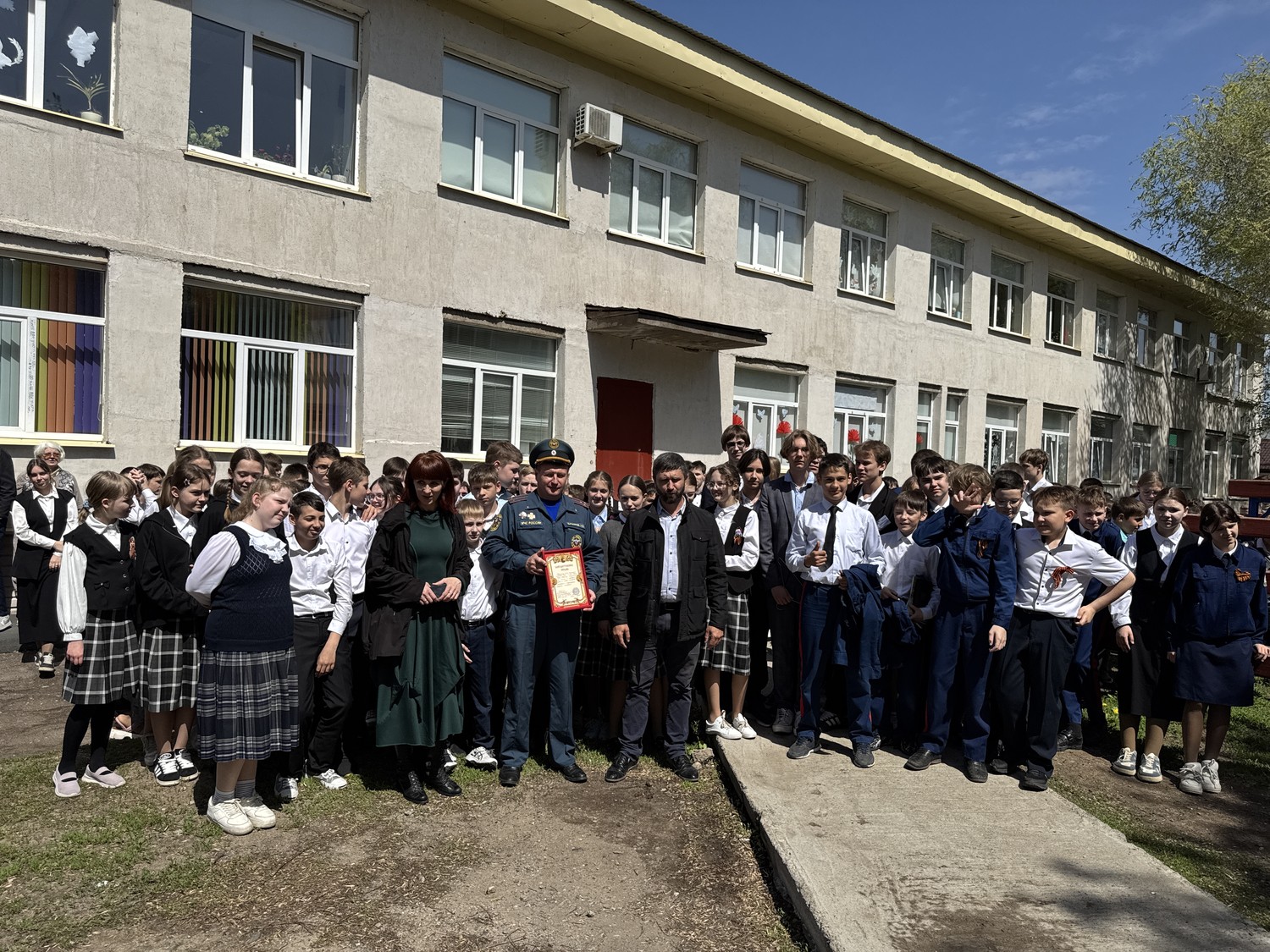 После сигнала тревоги учащиеся и педагоги быстро и слаженно покинули здание, выстроившись на безопасном расстоянии от условного очага возгорания.
