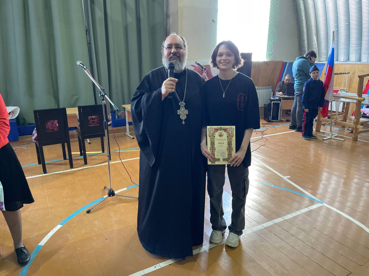 Каждого педагога встречали с тюльпанами, дарили открытки и угощения, а после молебна совет гимназии подготовил небольшой концерт для всех учителей и учениц. Ребята подарили всем присутствующим женщинам в зале много приятных и положительных эмоций.