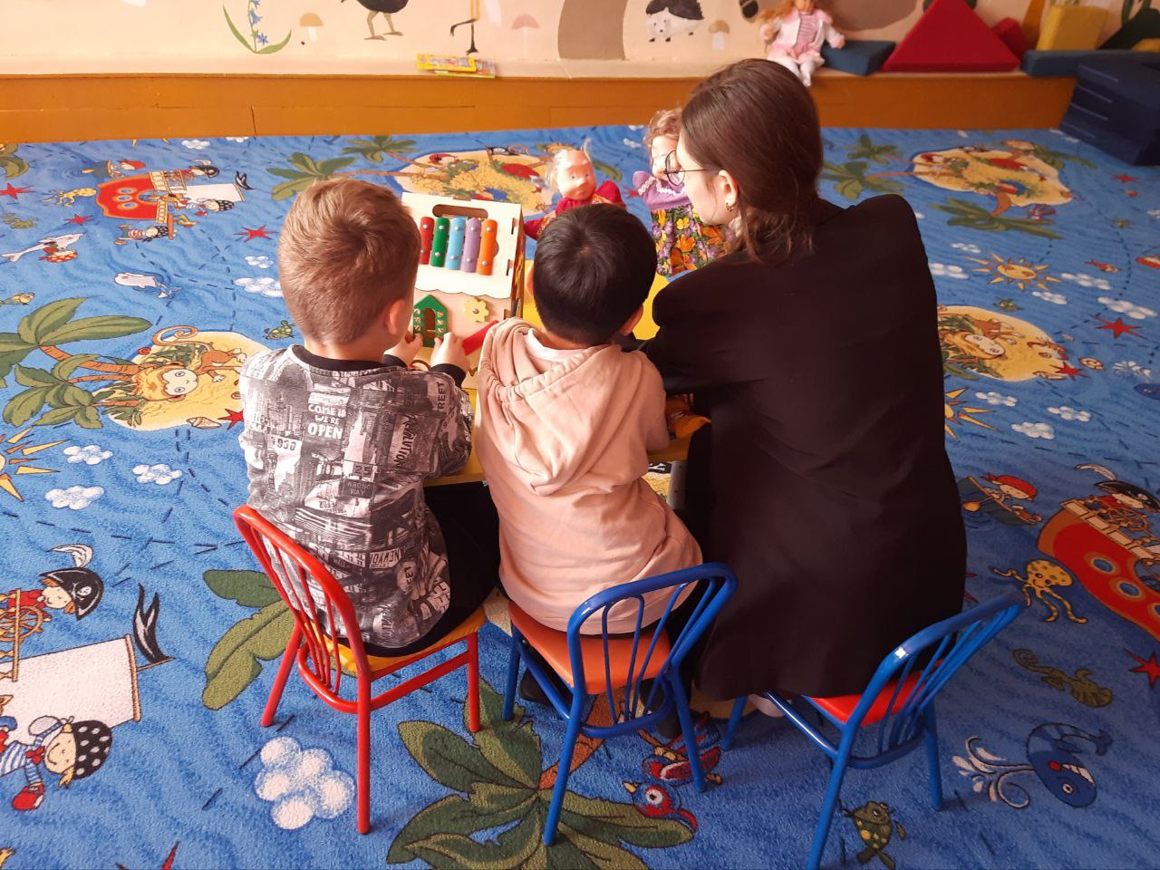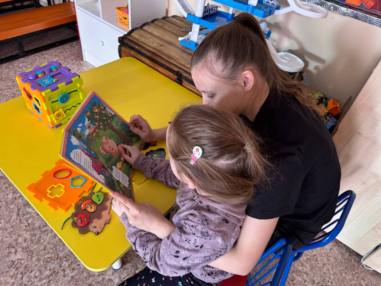 В кабинете досуга и коммуникации центра для детей с инвалидностью "Преображение" в рамках проекта "На крыльях сказки" каждое занятие начинается с волшебного путешествия в мир сказки. Вместе с детьми педагог оживляет любимые истории: дружно тянут репку, попадают в гости к медведю вместе с Машей, строят домики с тремя поросятами и спасаются от Мойдодыра. Для этого используется кукольный театр и яркий реквизит.