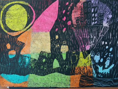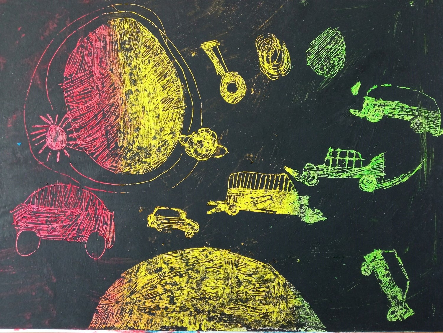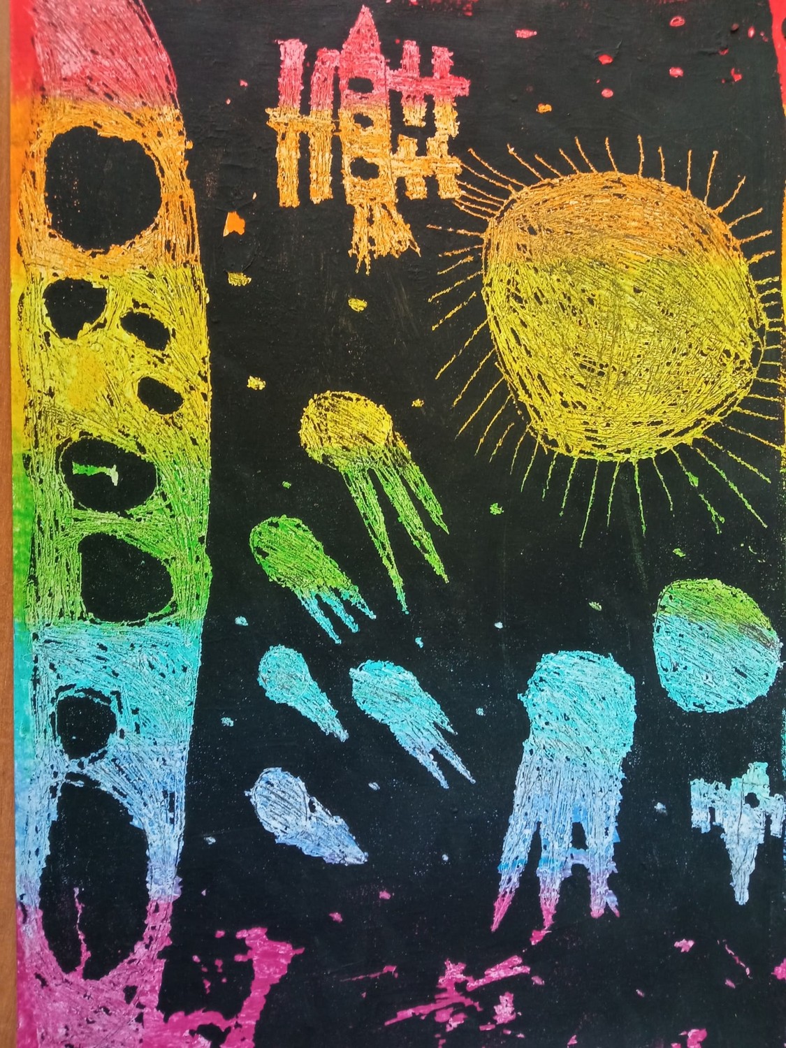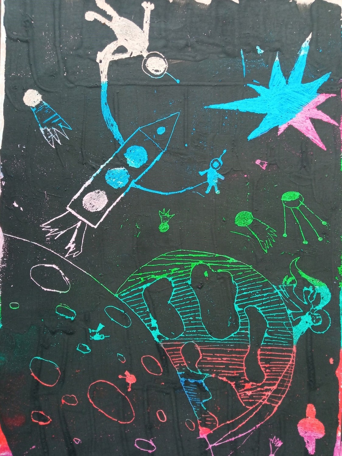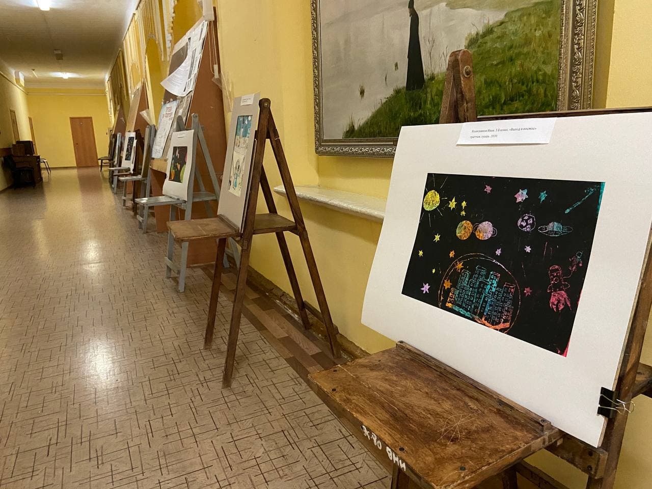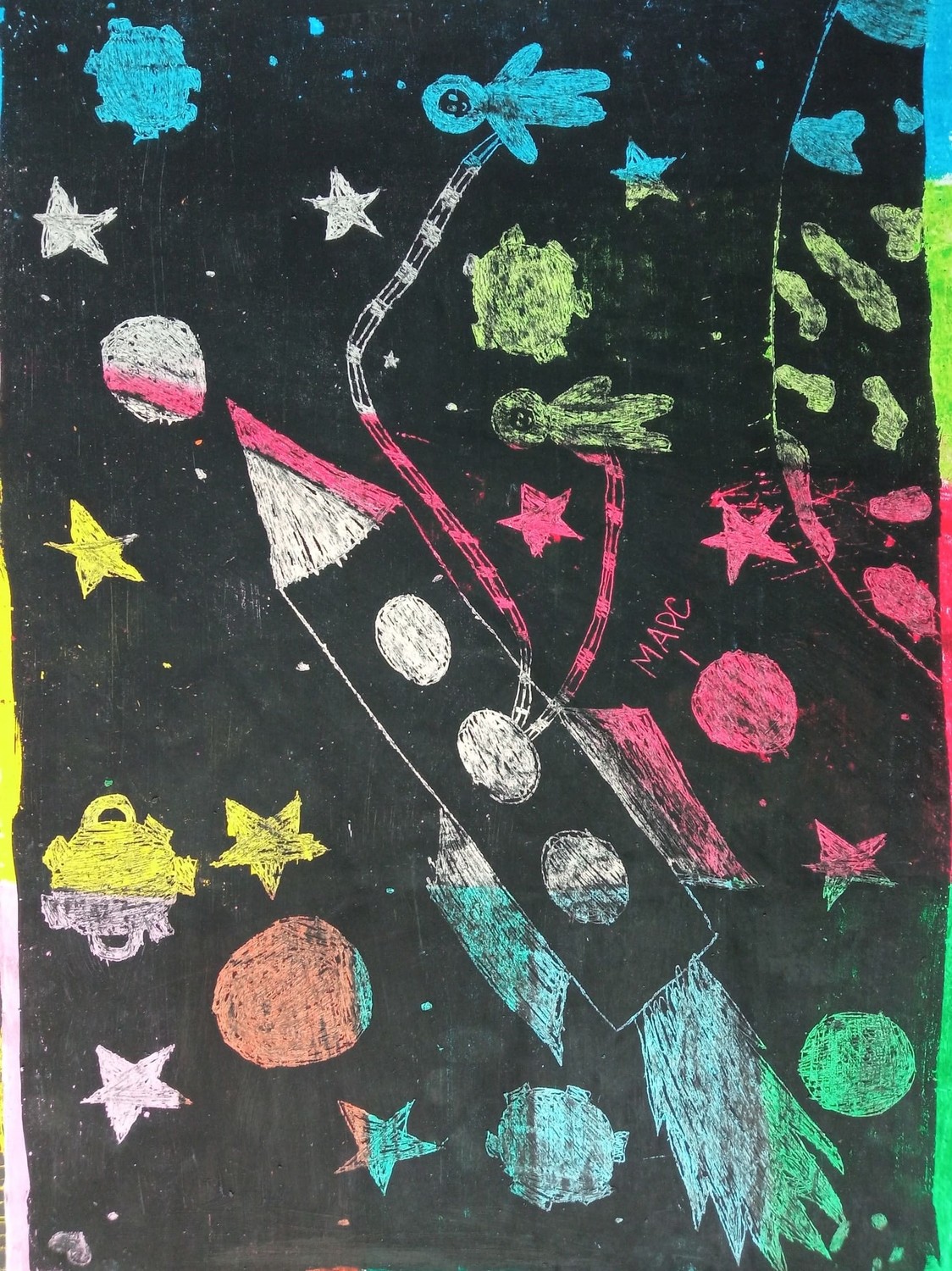 К юбилею полета первого космонавта земли изостудия подготовила выставку рисунков. Юрий Алексеевич в нашем городе "Получил путевку в небо", - как он сам признавался, и юные оренбуржцы с удовольствием отразили это в своем творчестве. Выставка демонстрирует работы, выполненные в оригинальной технике "граттаж" или грунтография (Колесников, И., Толстогузов И., Кушнир А., Михайлов И., Кувалдина П., Перов А.). Для того, чтобы выполнить рисунок, готовится специальное покрытие бумаги в два слоя: первый слой - восковыми мелками, а вторым слоем бумага покрывается густой гуашью темного цвета. По высыхании краски изображение процарапывается специальными стержнями и получается эффектный и выразительный рисунок. Работа трудоемкая, но очень любимая ребятами-студийцами. Кроме грунтографии на выставке представлены рисунки, выполненные акварелью и масляной пастелью (Артамонова М., Пыльнева Т., Демакина А.). Все участники экспозиции прекрасно раскрыли идею мечты о небесах человека, стремящегося преодолеть силу земного притяжения и вырваться в иные пространства для познания себя и Бога.