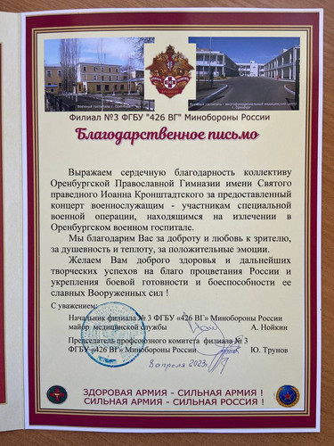 В субботу, 8 апреля, воспитанники Оренбургской православной гимназии 2«А» класса фольклорный ансамбль «Перегода" посетили военный госпиталь, чтобы поздравить с праздником Благовещения и Входа Господня в Иерусалим воинов, находящихся на лечении, которые были ранены в ходе СВО.